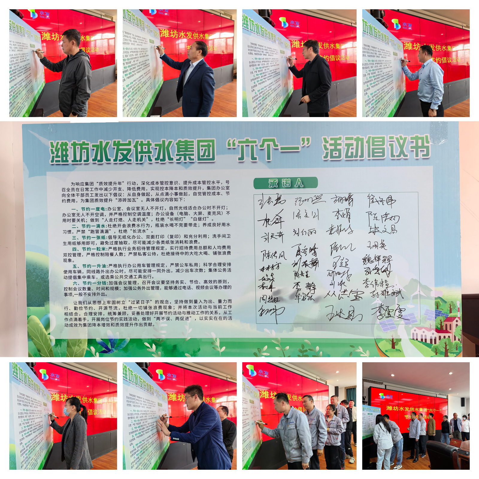 會(huì)上,供水集團(tuán)黨總支書記、董事長(zhǎng)張勇首先宣讀了“六個(gè)一”活動(dòng)倡議書,號(hào)召全體員工提升降本增效意識(shí),爭(zhēng)做勤儉辦公、節(jié)能降耗的先進(jìn)模范。隨后,供水集團(tuán)領(lǐng)導(dǎo)班子成員及參加活動(dòng)的干部職工紛紛在活動(dòng)展板上簽上自己的名字,承諾自覺(jué)踐行“六個(gè)一”節(jié)約倡議。